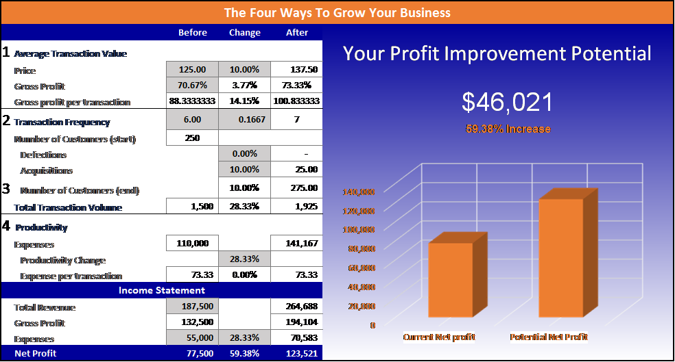 Punching these changes into the Business Accelerator Program you’ll find the business profit increases by $46,021 (59.38%) from $77,500 to $123,521.