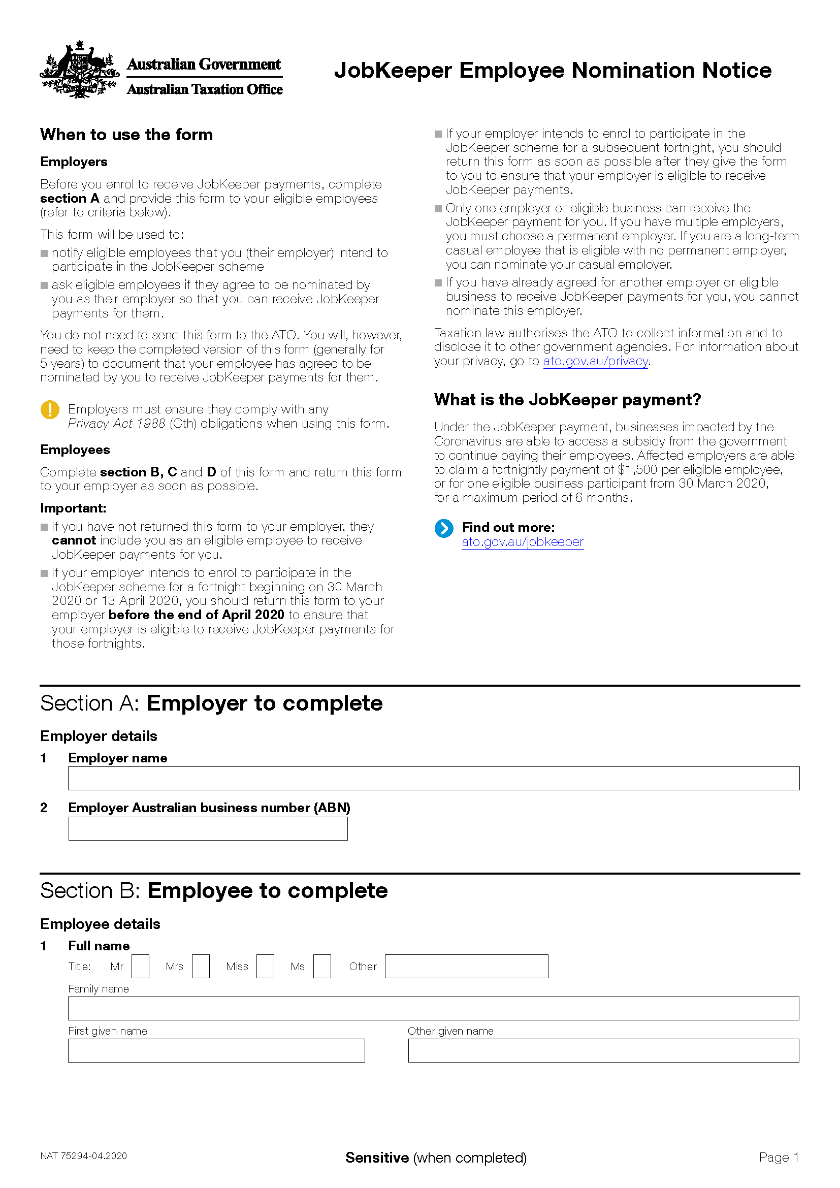 - Prepare JobKeeper employee nomination notice for all eligible employees and ensure all notices are signed